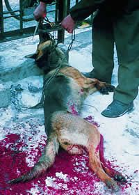 aufgeschlitzt, ...das Blut spritzt auf den Boden und der gequälte Hund