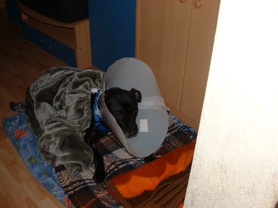 Fotos: 4 * Knuddel, Meine Schwester übt Gehorsam. Tyson bei Oma, Knuddel im neuen Höschen. Knuddel mit der blöden Plasik-Kutte.